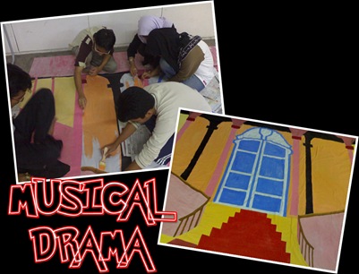 four days off is nothing for me...I need to spend all the time in KMS. The first day, people went back to their beloved home after the class. Some of them went back at night. I just stayed in my room...waiting for nothing. At night, we need to finish the props for the musical drama....painting the background of the drama....it was very tired....the picture was very big.....with a lot of colors....fuh!! what a challenging task. But I was lucky....because........I was not alone...I was surrounding with many supportive friends that never give up and always filled with high spirits to finish the task.....khairul, that always happy and full of jokes....aizat, or well known as 'pok jak'...that always pair with khairul to trick and make jokes to others...shahir, always cool and steady.....izyan, always got tricked by khairul and pok jak, and me too :P....maira, a very kind person.....hmm who else?...owhh one more, syitah, that suddenly appeared....brought some foods....that day, we all finished around 2 am if I not mistaken....the next day, we need to paint one more background....mountains....we started early in the morning, around eleven (is it early????)....then, we ordered domino pizza :P....we were hungry at that time, especially me hehe.....I ate about three slices...fuhh kenyang sangat....duit pn habis....we continued painting at night....but I need to finish a car...made by polystyrene....